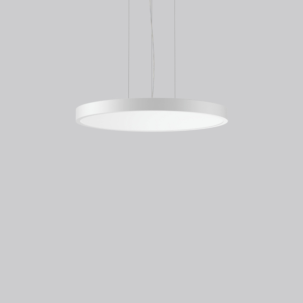 Dekorative runde LED Pendel-Flächenleuchte. Flacher nahtloser Rahmen Aluminium-Strangpressprofil pulverbeschichtet. Abdeckung Stahlblech pulverbeschichtet. Baldachin Aluminium pulverbeschichtet. Lichtaustritt über Diffusor Kunststoff opal. Diffusor und Lightguide aus vergilbungsfreiem Kunststoff (PMMA). Seitliche Lichteinkopplung (RZB SIDELITE-Technologie) für überdurchschnittlich homogene Leuchtdichteverteilung und randlose Ausleuchtung. Tunable White Versionen dynamisch einstellbar von 2700 K bis 6500 K. Für Human Centric Lighting (HCL) in Verbindung mit RZB-Lichtmanagementsystemen geeignet. 3-Punkt Stahlseilabhängung stufenlos höhenverstellbar. Einfache Montage mit transparenter, kürzbarer Pendelleitung und Baldachin mit Magnetbefestigung. Betriebsgerät integriert.