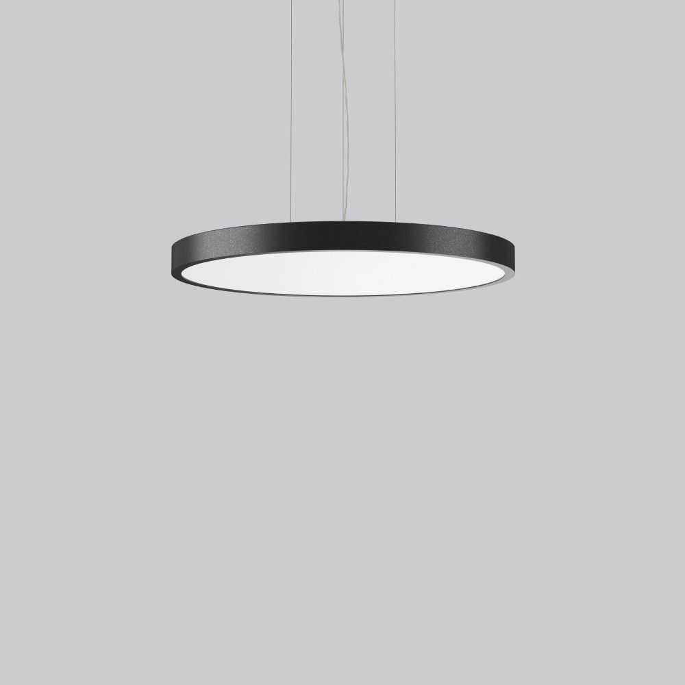 Dekorative runde LED Pendel-Flächenleuchte. Flacher nahtloser Rahmen Aluminium-Strangpressprofil pulverbeschichtet. Abdeckung Stahlblech pulverbeschichtet. Baldachin Aluminium pulverbeschichtet. Lichtaustritt über Diffusor Kunststoff opal. Diffusor und Lightguide aus vergilbungsfreiem Kunststoff (PMMA). Seitliche Lichteinkopplung (RZB SIDELITE-Technologie) für überdurchschnittlich homogene Leuchtdichteverteilung und randlose Ausleuchtung. 3-Punkt Stahlseilabhängung stufenlos höhenverstellbar. Einfache Montage mit transparenter, kürzbarer Pendelleitung und Baldachin mit Magnetbefestigung. Betriebsgerät integriert.
