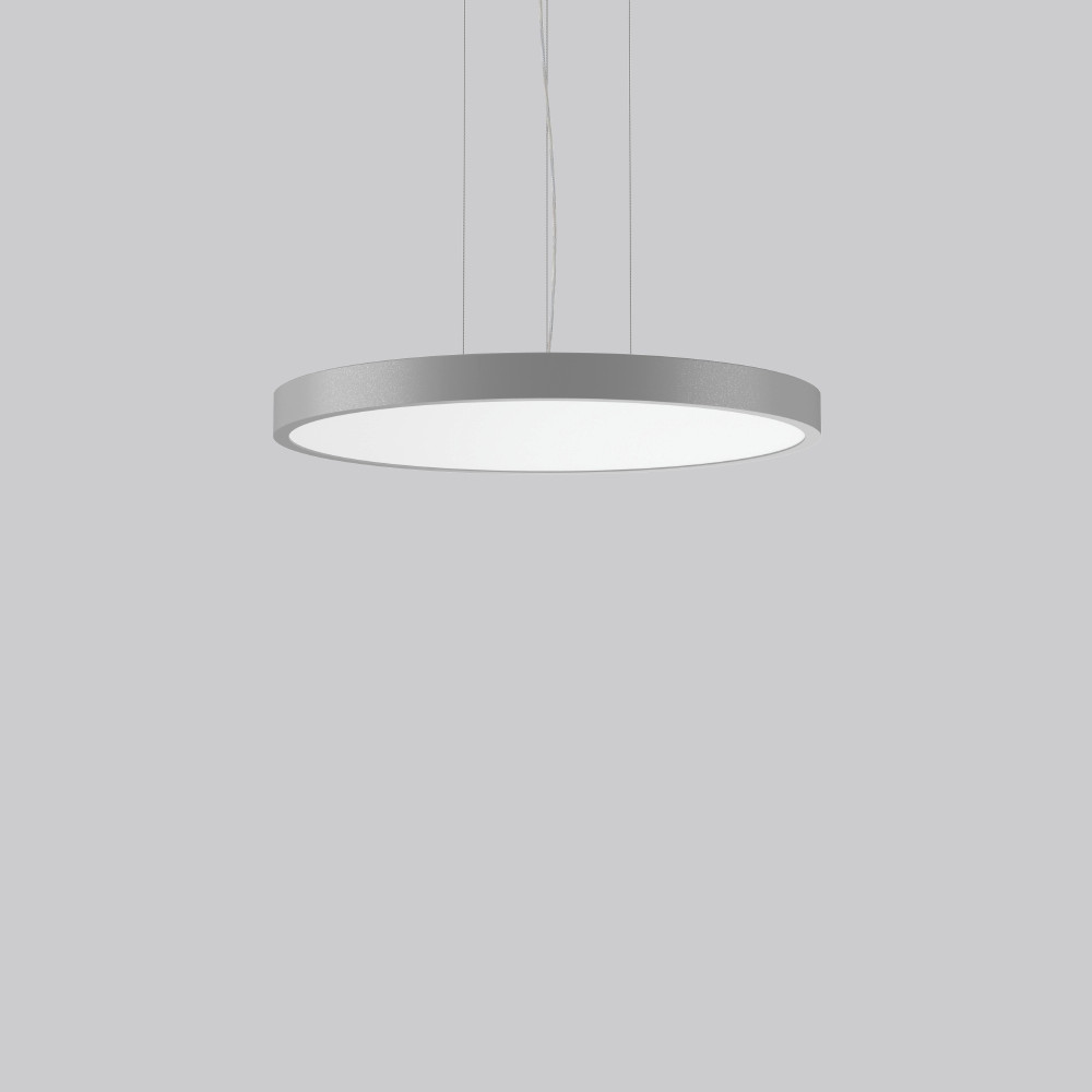 Dekorative runde LED Pendel-Flächenleuchte. Flacher nahtloser Rahmen Aluminium-Strangpressprofil pulverbeschichtet. Abdeckung Stahlblech pulverbeschichtet. Baldachin Aluminium pulverbeschichtet. Lichtaustritt über Diffusor Kunststoff opal. Diffusor und Lightguide aus vergilbungsfreiem Kunststoff (PMMA). Seitliche Lichteinkopplung (RZB SIDELITE-Technologie) für überdurchschnittlich homogene Leuchtdichteverteilung und randlose Ausleuchtung. Tunable White Versionen dynamisch einstellbar von 2700 K bis 6500 K. Für Human Centric Lighting (HCL) in Verbindung mit RZB-Lichtmanagementsystemen geeignet. 3-Punkt Stahlseilabhängung stufenlos höhenverstellbar. Einfache Montage mit transparenter, kürzbarer Pendelleitung und Baldachin mit Magnetbefestigung. Betriebsgerät integriert.