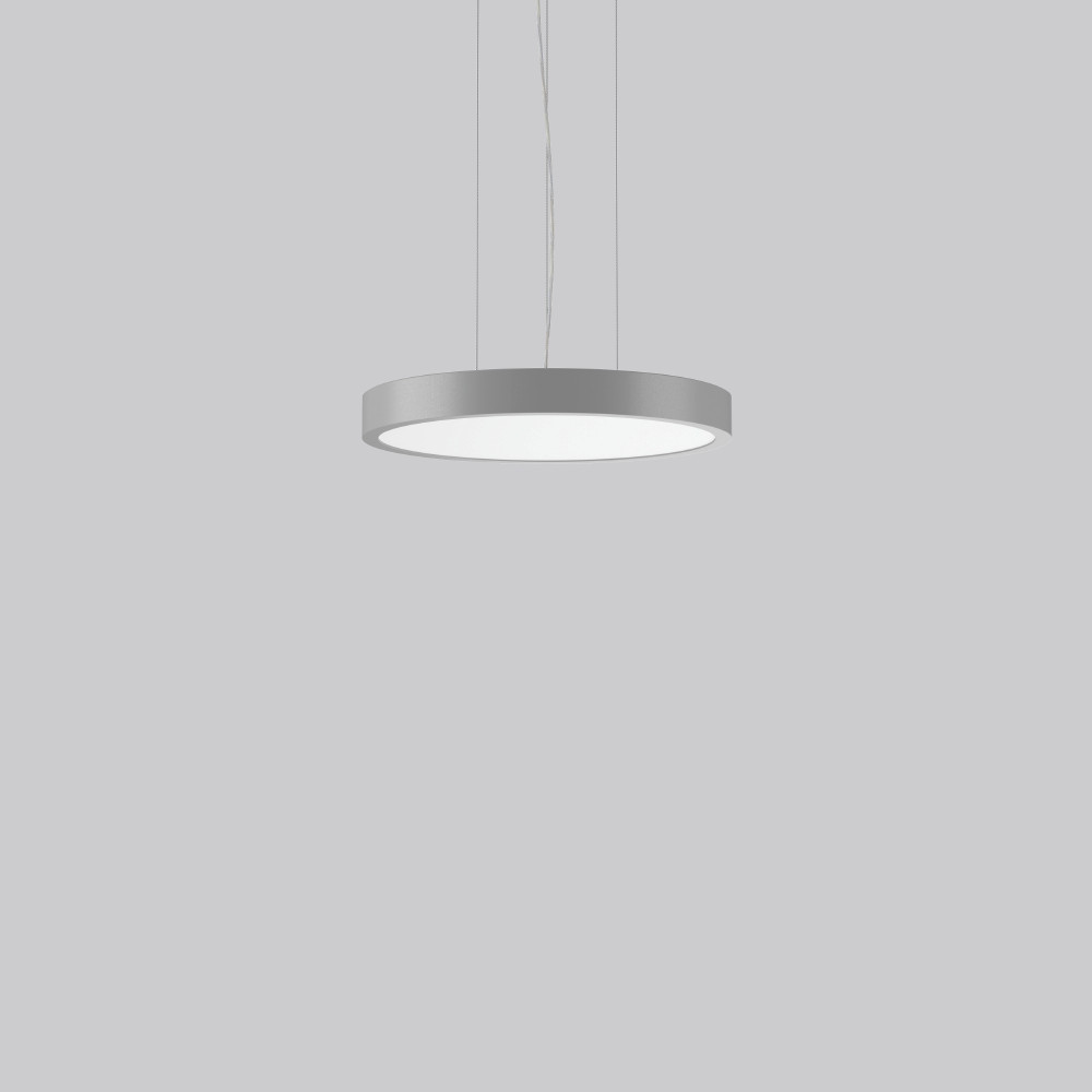 Dekorative runde LED Pendel-Flächenleuchte. Flacher nahtloser Rahmen Aluminium-Strangpressprofil pulverbeschichtet. Abdeckung Stahlblech pulverbeschichtet. Baldachin Aluminium pulverbeschichtet. Direkter Lichtaustritt über Diffusor Kunststoff opal. Indirekter Lichtaustritt über flächenbündigen Diffusor aus Kunststoff satiniert. Diffusor und Lightguide aus vergilbungsfreiem Kunststoff (PMMA). Seitliche Lichteinkopplung (RZB SIDELITE-Technologie) für überdurchschnittlich homogene Leuchtdichteverteilung und randlose Ausleuchtung. Lichtaustritt direkt 70%, indirekt 30%. 3-Punkt Stahlseilabhängung stufenlos höhenverstellbar. Einfache Montage mit transparenter, kürzbarer Pendelleitung und Baldachin mit Magnetbefestigung. Betriebsgerät integriert. Mit Casambi smart+free Bluetooth Steuerung zur drahtlosen Vernetzung und Bedienung mittels Android / iOS Gerät, kostenlose App zum Download verfügbar.