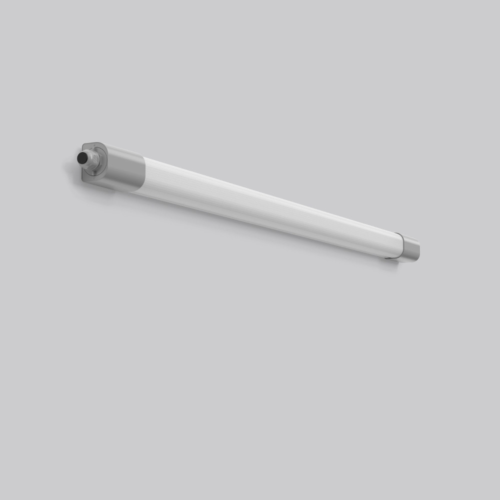 Feuchtraumleuchte mit schlanker und flacher Gehäuseform. Seitenteile Kunststoff (Polycarbonat) grau, schlagzäh. Diffusor aus Kunststoff (Polycarbonat) opal, schlagzäh. Diffusor extrudiert, innenprismatisch und UV-beständig. Lichtverteilung symmetrisch. Homogene Ausleuchtung. Rückwärtiger Lichtanteil zur Deckenaufhellung. Flexible Installation durch verschiebbare Montagebügel. Ideal bei Leuchtenaustausch. Deckenmontagebügel aus Edelstahl und Triangel-Bügel für Pendelmontage im Lieferumfang enthalten. Leuchte mit integrierter 4-poliger Durchgangsverdrahtung für das Aneinanderreihen von weiteren Leuchten. Komfortable Leitungseinführung über Kabelverschraubungen. Einfache Installation durch herausnehmbare Steckverbindung und Drehverschluss auf beiden Seiten. Austauschbare und herausnehmbare LED-Einheit mit integriertem Betriebsgerät. MultiLumen: Einstellbarkeit des Leuchtenlichtstroms in 2 Stufen. Werkseitig auf höchsten Leuchtenlichtstrom voreingestellt. Leuchte mit begrenzter Oberflächentemperatur nach DIN EN 60598-2-24 zur Verwendung in einer Umgebung, in der eine Ablagerung von leitfähigem Staub auf der Leuchte erwartet werden kann. Zugelassen für den Einsatz in der Lebensmittel- und Getränkeindustrie.