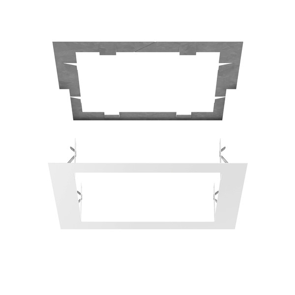Einbaurahmen Stahlblech blank/pulverbeschichtet (2-teilig) zur werkzeuglosen Montage von Einbauleuchten in bauseits vorhandene Deckenausschnitte. Federbefestigung. Vorhandener Deckenausschnitt: LAxBA 305, 355 mm. Geeignet für Einbauleuchten mit Deckenausschnitt: LAxBA 290, 300 mm.