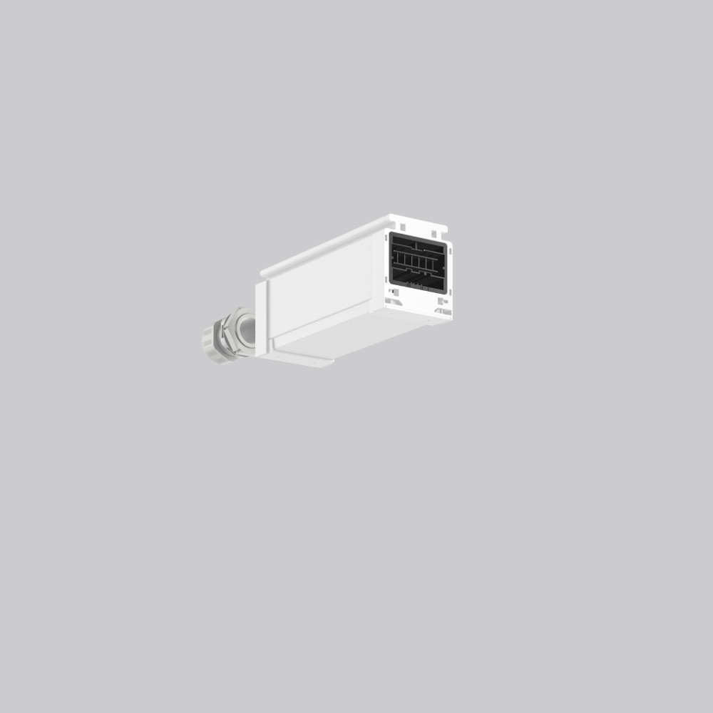 Anfangseinspeisung, 7-polig, Anschluss Buchse. Gehäuse Stahlblechprofil beschichtet. Abdeckung Kunststoff weiß. LINEDO Steckersystem aus Kunststoff schwarz. 1 Kabelverschraubung (M25). Kabelverschraubung wahlweise seitlich oder oben. Komfortabler Anschluss mit Flachstecker.