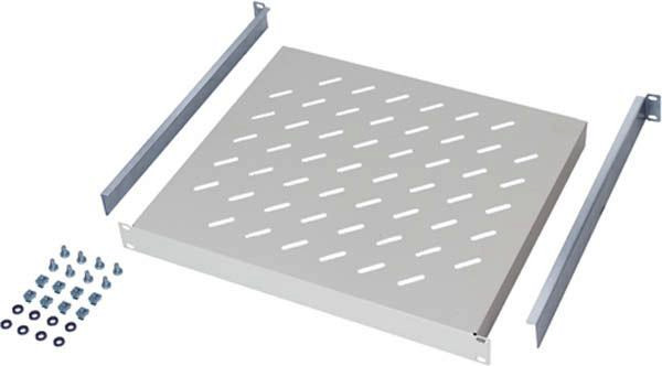 19“ Fachboden für den Festeinbau, mit passiver Belüftung, wird im Lochraster der vorderen und hinteren Ebene montiert.
