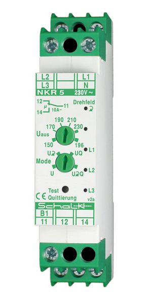 Die Netzüberwachungsrelais werden zur Überwachung von ein- bis dreiphasigen Netzen eingesetzt. Beim Einsatz in einem Drehstromnetz kann zusätzlich zur Spannung die Phasenlage überwacht werden. Die Schaltschwelle kann von 150 bis 230V frei, oder auf einen definierten Festwert von 196V (DIN VDE) eingestellt werden. Beim NKR 5 wird der Zustand der Phasenspannungen und der Drehfeldrichtung über 4 LEDs angezeigt. Ein Phasenausfall wird optisch durch eine blinkende LED gespeichert. Das Relais schaltet entweder automatisch nach Spannungswiederkehr, oder erst nach Quittierung durch den internen oder einen externen Taster ein (Fehlerspeicher-Funktion)., Maße: 18x55mm, 230V AC ,1 Wechsler 10A potentialfrei, Uvar 150-230V, Ufix 196V