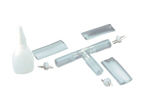 T-Steckverbinder T-Steckverbinder-Set für Lichtschlauch, mit 1 T-Steckverbinder, 5x Schrumpfschlauch (klar) 3x Einspeisepins, 1x Kleber und 2 Endkappen Energieeffizienzklasse: nicht kennzeichnungspflichtig