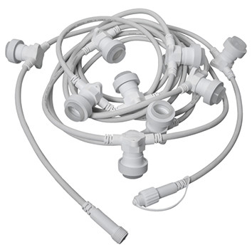 Universal-Lichterkette 7,35m weiß kombinierbares 230V-Universal-outdoor-System, 7,35 m lange, weiße Lichterkette für den Außenbereich, mit 10 E27-Fassungen (max. 15W /Fassung), benötigt Startkabel. Anschluss bis zu 2.000W/System.