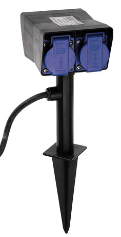 Verteiler 2-fach 400x105x70mm IP 44 2-fach-Schutzkontaktsteckdosen, max. 3500W, 2m Leitung, schwere Gummischlauchleitung H07RN-F 3G1,5. Witterungsbeständiger, bruchfester Spezialkunststoff, Sicherheitsklappdeckel mit Hammerzeichen.