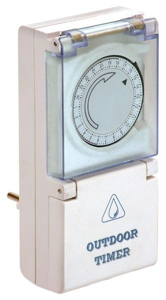 Tages-Zeitschaltuhr mechanisch Mechanische Zeitschaltuhren bieten eine komfortable Ein-/Aus-Schaltung von angeschlossenen Geräten wie z. B. Leuchten, Radiatoren, Radiogeräten, etc. Tageszeitschaltuhren bieten einen Schaltabstand von 15 Minuten. Spritzwassergeschützte Zeitschaltuhren für die Benutzung im Außenbereich zeichnen sich durch ein sehr robustes Gehäuse und eine spritzwassergeschützte (IP44) Schutzkontaktsteckdose aus. Sie eignen sich für Feuchträume in denen z.B. Wäschetrockner oder Waschmaschinen untergebracht sind, sowie bei geschützter Anbringung für Geräte im Außenbereich (z.B. Garten oder Teichbeleuchtung, Außenbeleuchtung, etc.