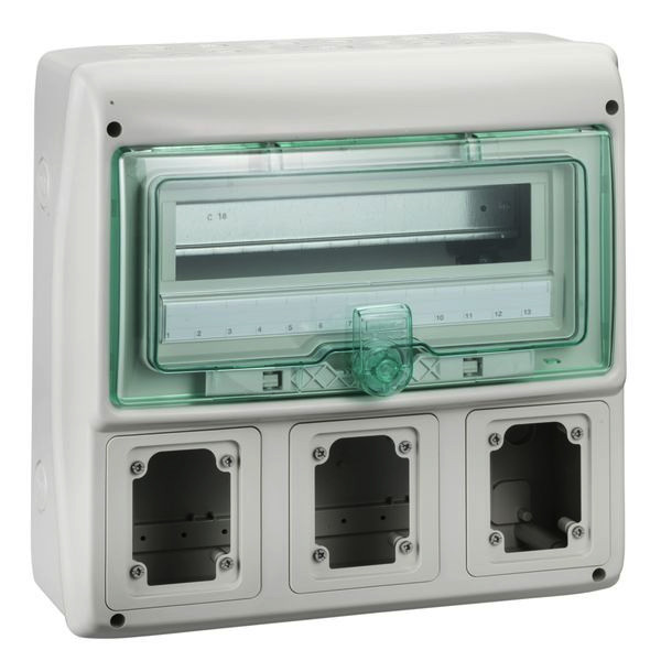 Kaedra wetterfestes Aufputzgehäuse mit der Möglichkeit von verschiedenen Einbauten, 3 Montagestellen für Steckdosen 90x100mm, 12+1 TE für Reiheneinbaugeräte. IP-Schutzklasse - IP65. Es können alle Arten von modularen Reiheneinbaugeräte installiert werden und es gibt Platz für die installation von Industrie- oder Haushaltssteckdosen, Taster oder Kontrollleuchten. Das Gehäuse ist mit einer transparenten grünen Tür für modulare Reiheneinbaugeräte ausgestattet. Die Farbe des Gehäuses ist hellgrau (RAL 7035). Es ist für die Neuinstallation oder Renovierung in Wohn-/Zweckgebäuden oder auch vielen anderen Bereichen vorgesehen. Die Kabel können über vorgestanzte Öffnungen an der Ober- oder Unterseite des Gehäuses eingeführt werden. 1 Klemmenblock wird mitgeliefert. Die Anschlussklemmen haben 8 Abgänge. Das Gehäuse hat die Schutzklasse II und ist bis zu einem Nennstrom von 63A zugelassen.