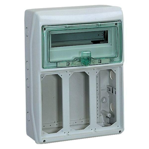 Kaedra wetterfestes Aufputzgehäuse mit der Möglichkeit von verschiedenen Einbauten, 3 Montagestellen für verriegelbare Steckdosen 103x225mm, 12+1 TE für Reiheneinbaugeräte. IP-Schutzklasse - IP65. Es können alle Arten von modularen Reiheneinbaugeräte installiert werden und es gibt Platz für die installation von Industriesteckdosen. Das Gehäuse ist mit einer transparenten grünen Tür für modulare Reiheneinbaugeräte ausgestattet. Die Farbe des Gehäuses ist hellgrau (RAL 7035). Es ist für die Neuinstallation oder Renovierung in Zweckgebäuden oder auch vielen anderen Bereichen z.B. Industrie vorgesehen. Die Kabel können über vorgestanzte Öffnungen an der Ober- oder Unterseite des Gehäuses eingeführt werden. 1 Klemmenblock wird mitgeliefert. Die Anschlussklemmen haben 8 Abgänge. Das Gehäuse hat die Schutzklasse II und ist bis zu einem Nennstrom von 63A zugelassen.