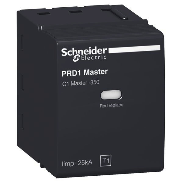 Ersatz-Schutzmodul für PRD1 Master, C1 Master-350. 1-polig, Überspannungsableiterklasse Typ 1, 2 TE, Erdungssystem TT und TN, Nennableitstoßstrom 25kA, Betriebsbemessungsspannung (Ue) 230V AC. Steckbar. Schutz gegen direkten Blitzeinschlag in elektrischen Anlagen in allen Industrie- und Tertiärgebäuden mit Blitzableiter. Das Ersatz-Schutzmodul für PRD1 Master, C1 Master-350 erfüllt folgende Normen IEC 61643-1 und EN 61643-11.