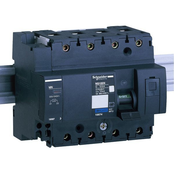 Unterspannungsauslöser Acti 9 MN. Betriebsspannung (Ue) 230-240V AC. Verursacht die Auslösung des Gerätes, mit dem es kombiniert wurde, wenn die Eingangsspannung abnimmt. Verhindert ein Schließen des Gerätes, bis die Eingangsspannung wiederhergestellt wurde.