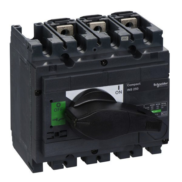 Compact INS Lasttrennschalter. Lasttrennschalter INS250, 250A/690V AC / 250V DC, Drehantrieb schwarz. Nennstrom 250 A, Polzahl 3. Komplettgeräte mit schwarzem Schalthebel. Trennereigenschaften nach VDE 0660 Teil 100. Drehantrieb frontal oder seitlich bis INS250.