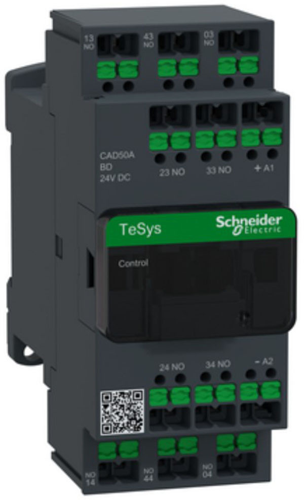 Hilfsschütze TeSys Control CAD. Hilfsschütz für die Gebrauchskategorien AC-15 bis 690V und DC-13 bis 440V. Es bietet 5 Kontakte (5S), eine 24 V DC Spule. Für anspruchsvolle Anwendungen mit hohen Betriebsgeschwindigkeiten bis zu 10800 Zyklen/Stunde sorgt er für hohe Zuverlässigkeit und Haltbarkeit. Fünf integrierte Hilfskontakte, erweiterbar um bis zu neun Hilfskontakte. Schnelle, sichere und wartungsfreie Stromverbindung mit SnapIN Anschlussklemme. Geeignet für Sicherheitsanwendungen durch mechanisch gekoppelte Kontakte und Spiegelkontakte.