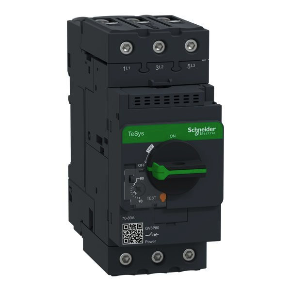 Motorschutzschalter mit thermischer und magnetischer Auslösung - TeSys GV3. 3-phasig, Nennstrom einstellbar von 70 - 80A für eine Motorleistung von 45kW bei 400V. Normkonform zu IEC/EN 60947-4-1, EC/EN 60947-2, UL 60947-4-1 und CSA C22.2 Nr. 60947-4-1. Eigenschaften: wartungsarme Klemmentechnologie EverLink (abnehmar), optimierten Baubreite von nur 55mm, intern verbaubare Hilfskontakte, blombierbaer Einstellbereich sowie Abschließbarkeit in Aus - Position ohne Zubehör. Für höchste Anforderungen im Bereich des Kurzschlussschutzes. Verwendbar für Motoren aller Energieeffizienz Klassen IE0 - IE4 bis 14 fachem Nennstrom.
