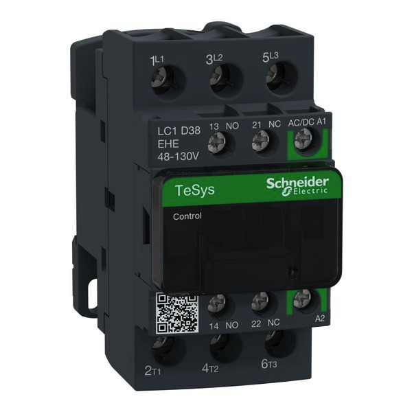 Leistungsschütz TeSys LC1D. 3 polig, 3 Schließer. Zusätzliche Hilfskontakte- 1 Schließer + 1 Öffner, Bemessungsbetriebsleistung bei AC-3, 400 V 18.5 kW, Bemessungsbetriebsstrom Ie bei AC-3, 400 V 38 A, Spule 48-130 V AC/DC. Abmessung (BxHxT) 45x85x92 mm, Gewicht 0,442 kg. Kategorie AC-3, AC-1. Spule- AC/DC, elektronisch, Integrierte bidirektionale Spitzenbegrenzung. Schnelle und einfache Einrichtung. Sichere und langlebige Stromverbindung mit Everlink und Federklemmen. Geeignet für Sicherheitsanwendungen durch mechanisch gekoppelte Kontakte und Spiegelkontakte.