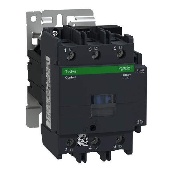 Leistungsschütz TeSys LC1D. 3 polig, 3 Schließer. Zusätzliche Hilfskontakte- 1 Schließer + 1 Öffner, Bemessungsbetriebsleistung bei AC-3, 400 V 37 kW, Bemessungsbetriebsstrom Ie bei AC-3, 400 V 80 A, Spule 110 V DC. Abmessung (BxHxT) 85x127x186 mm, Gewicht 2,59 kg. Kategorie AC-4, AC-1, AC-3. ohne integriertes Beschaltungsmodul. Schnelle und einfache Einrichtung. Sichere und langlebige Stromverbindung mit Everlink und Federklemmen. Geeignet für Sicherheitsanwendungen durch mechanisch gekoppelte Kontakte und Spiegelkontakte. Zertifizierungen nach CSA, BV, CCC, UL, GOST, LROS (Lloyds register of shipping), DNV, GL, RINA. Produktstandards gem.