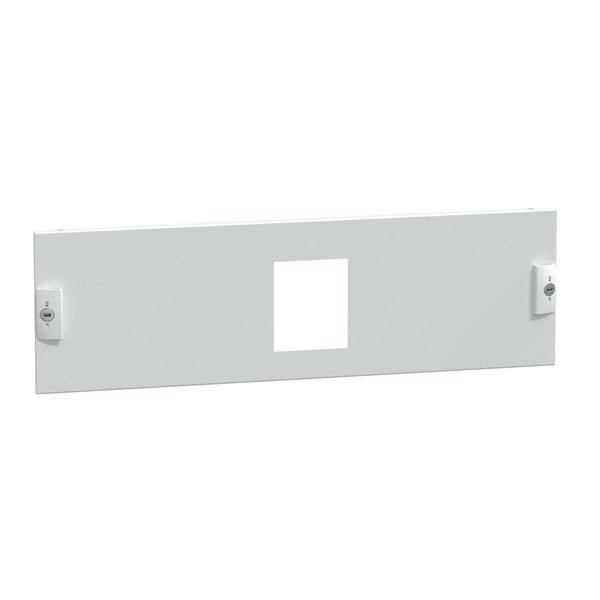 PrismaSeT P. Frontplatte mit Ausschnitt für einen 3- oder 4-poligen ComPacT NSXm bis 160 A mit direktem Drehantrieb in horizontaler Einbaulage und Festeinbautechnik, mit einer Höhe von 3 Moduleinheiten für Schaltschränke mit einer Breite von 650 mm. Pulverbeschichtet in RAL9003 struktur.