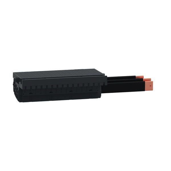 PrismaSeT P. Linergy FC Einspeiseblock für fünf 3-polige ComPacT NSXm bis 160 A mit Kipphebelantrieb oder direktem Drehantrieb in vertikaler Einbaulage und Festeinbautechnik. mit einem vorkonfektionierten Anschluss an eine vertikale Linergy BS oder LGYE Sammelschiene, mit einer Bemessungsstoßstromfestigkeit (Ipk) 18 kA, Bemessungskurzschlussstrom (Icc) 50 kA mit einspeiseseitigem Schutz von 85 kA (Icc). Bemessungsisolationsspannung (Ui) 800 V AC, Bemessungsspannung (Ue) 690 V AC, Bemessungsstoßspannungsfestigkeit (Uimp) 8 kV.