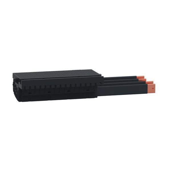 PrismaSeT P. Linergy FC Einspeiseblock für vier 4-polige ComPacT NSXm oder NSXm Vigi bis 160 A mit Kipphebelantrieb oder direktem Drehantrieb in vertikaler Einbaulage und Festeinbautechnik. mit einem vorkonfektionierten Anschluss an eine vertikale Linergy BS oder LGYE Sammelschiene, mit einer Bemessungsstoßstromfestigkeit (Ipk) 18 kA, Bemessungskurzschlussstrom (Icc) 50 kA mit einspeiseseitigem Schutz von 85 kA (Icc). Bemessungsisolationsspannung (Ui) 800 V AC, Bemessungsspannung (Ue) 690 V AC, Bemessungsstoßspannungsfestigkeit (Uimp) 8 kV.