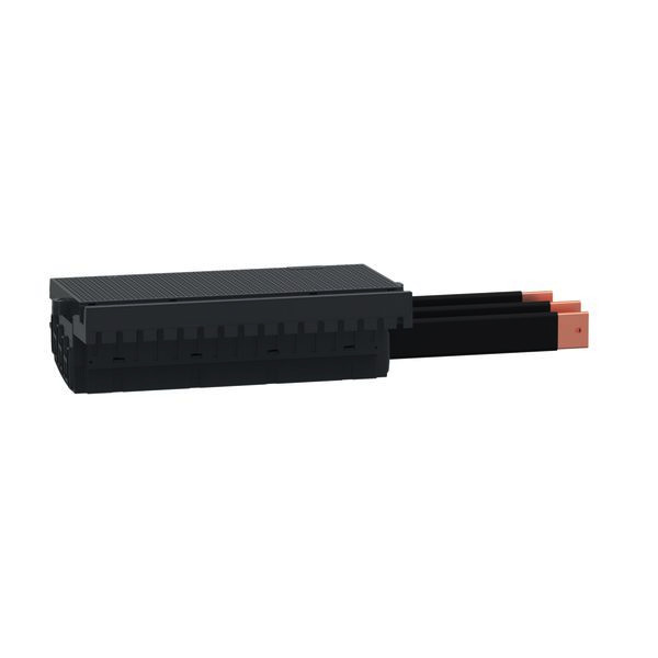 PrismaSeT P. Linergy FC Einspeiseblock für vier 3-polige ComPacT NSXm Vigi bis 160 A mit Kipphebelantrieb oder direktem Drehantrieb in vertikaler Einbaulage und Festeinbautechnik. mit einem vorkonfektionierten Anschluss an eine vertikale Linergy BS oder LGYE Sammelschiene, mit einer Bemessungsstoßstromfestigkeit (Ipk) 18 kA, Bemessungskurzschlussstrom (Icc) 50 kA mit einspeiseseitigem Schutz von 85 kA (Icc). Bemessungsisolationsspannung (Ui) 800 V AC, Bemessungsspannung (Ue) 690 V AC, Bemessungsstoßspannungsfestigkeit (Uimp) 8 kV.