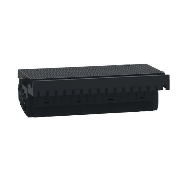 PrismaSeT P. Linergy FC Einspeiseblock für fünf 3-polige ComPacT NSXm Vigi bis 160 A mit Kipphebelantrieb oder direktem Drehantrieb in vertikaler Einbaulage und Festeinbautechnik. ohne vorkonfektionierten Anschluss an eine vertikale Linergy BS oder LGYE Sammelschiene, mit einer Bemessungsstoßstromfestigkeit (Ipk) 18 kA, Bemessungskurzschlussstrom (Icc) 50 kA mit einspeiseseitigem Schutz von 85 kA (Icc). Bemessungsisolationsspannung (Ui) 800 V AC, Bemessungsspannung (Ue) 690 V AC, Bemessungsstoßspannungsfestigkeit (Uimp) 8 kV.
