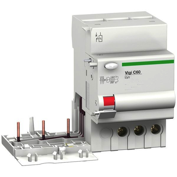 Fehlerstromschutzschalter Vigi C60 Multi 9 OEM, 300mA. 3-polig, Nennstrom 63A, Typ AC, Betriebsspannung (Ue) 400-415V, Isolationsspannung (Ui) 500V AC. Vigi C60 Fehlerstromschutzblöcke für C60 bieten Schutz gegen Stromschlag durch direkte und indirekte Berührung und Brandschutz bei Isolationsfehlern. Technologie der Auslöseeinheit- Differenzstrom. An Leitungsschutzschalter, die mit einem Vigi-Modul kombiniert werden, kann weiterhin zusätzliches Zubehör angebaut werden. Zusätzlich anreihbare Hilfsmodule (optional)- Anzeige von Schaltstellung (OF), Fehlerauslösung (SD), Arbeitsstromauslöser (MX, MX+OF), Unterspannungsauslöser (MN, MNs, MNx). Werkzeuglose Montage linksseitig am Gerät. Der Vigi C60 Fehlerstromschutzschalter erfüllt folgende Normen- IEC/EN 61009-1.