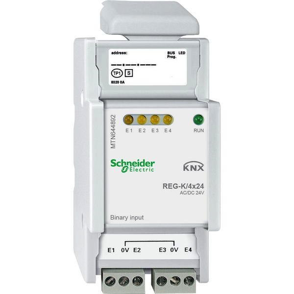 Schneider Electric KNX. Zum Anschluss von 4 konventionellen Geräten mit AC/DC 24 V-Ausgängen an KNX. Mit integriertem Busankoppler und steckbaren Schraubklemmen. Je Eingang wird der Eingangsspannungspegel mit einer gelben LED angezeigt. Eine grüne LED zeigt nach dem Laden der Applikation die Betriebsbereitschaft an. Für die Montage auf Hutschienen TH35 nach EN 60715. Der Busanschluss erfolgt über eine Busanschlussklemme. Eingangsspannung: AC/DC 24 V, Eingänge: 4 Eingangsstrom: DC 15 mA (30 V), AC 6 mA (27 V), 0-Signal: / 11 V, Leitungslänge: max. 100 m, Gerätebreite: 2,5 TE entspricht ca 45 mm. Lieferumfang: Mit Busanschlussklemme und Leitungsabdeckung. Farbe: lichtgrau.