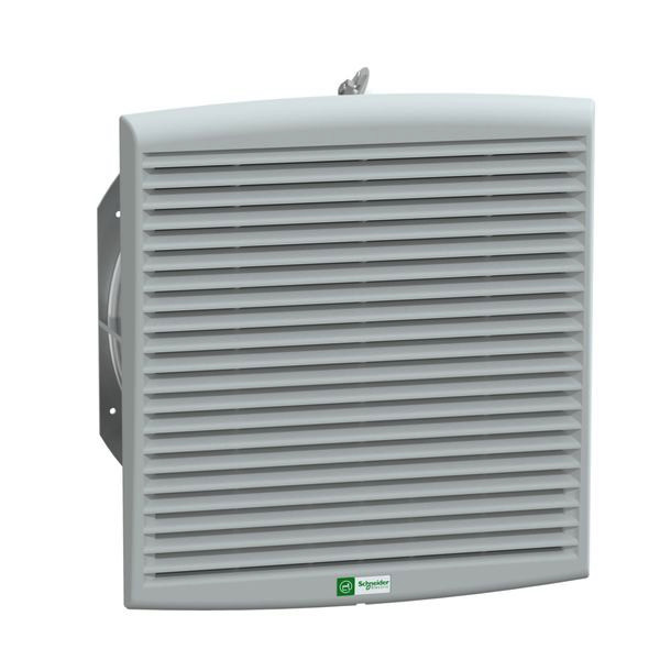 ClimaSys CV Axial-Motorlüfter. 115V 50Hz oder 60Hz. Freier Durchfluss mit Standardfilter von 944 m3/h bei 50 Hz und 983 m3/h bei 60 Hz. Ausschnittabmessungen von 291 x 291 mm. Auslassgitter aus gespritztem Thermoplast (ASA PC), Grau RAL 7035. Anschlussklemmen über Kabel. 2 Schutzgitter auf der Vorder- und Rückseite. Schutzart IP54.