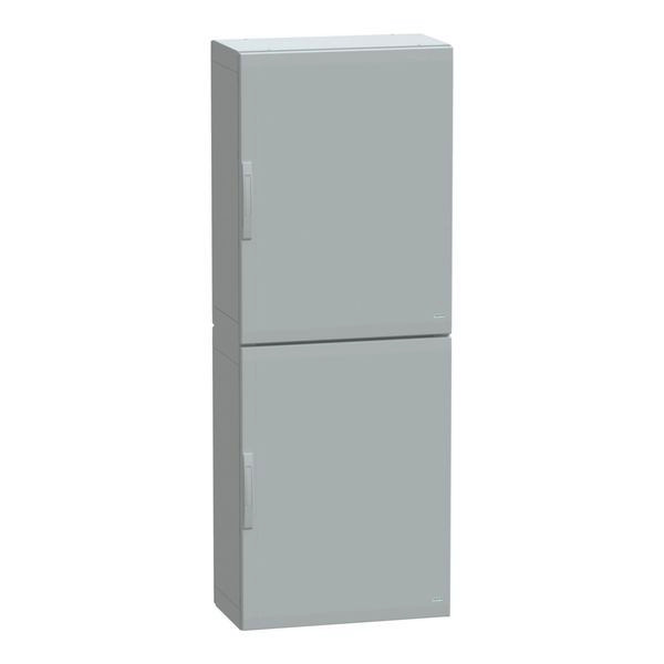 PanelSeT PLA Standgehäuse aus Polyester, vollständig abgedichtet, Version PLA. Versiegeltes Ober- und Unterteil, mit Seitenteilen montiert. 4-Punkt-Türverriegelung mit 5-mm-Doppelstangenschlössern. 2 Türen Typ transparente Front. Polyester verstärkt mit Glasfaserkörper. Schutzart IP 65, IK10, Grau RAL 7035.