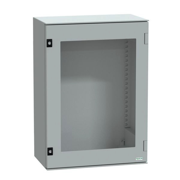| Kurzbeschreibung | PanelSeT PLM Polyestergehäuse - Wandmontage, transparente Tür, ohne MP H747xB536xT300mm IP66, IK10, RAL 7035 |