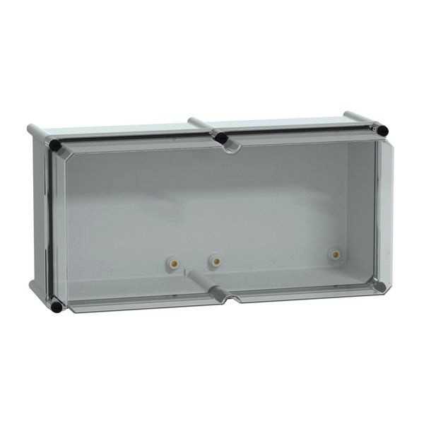 PanelSeT PLS Gehäuse aus Polyester mit transparentem PC-Deckel. Isolierende modulare Dose. Einteilig gegossenes Gehäuse. Wandmontage. Hochtransparente Abdeckung, Deckelverriegelungsschraube abnehmbar. Polyester mit Glasfaserverstärkung auf der Rückseite, Abdeckung aus Polycarbonat. Grau RAL 7035. IP65, IK09, NEMA (13,4X) 960°C Feuerbeständigkeit. Isolierstoffklasse II.