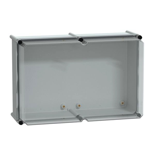 PanelSeT PLS Box Polyester Rückseite mit transparenter PC-Abdeckung. Isolierende Modulbox. Einteiliger Formkörper. Wandmontage. Hochtransparente Abdeckung, Deckelverriegelungsschraube abnehmbar. Polyester verstärkt mit Glasfaserrückseite, Polycarbonatabdeckung. Grau RAL 7035. IP65, IK09, NEMA (13,4X) 960°C Feuerbeständigkeit. Isolationsklasse II.
