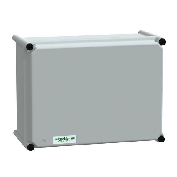 PanelSeT PLS Box Polyester hinten mit opaker Polyesterabdeckung. 270 x 360x 180 mm. Isolierende Modulbox. Einteiliger Formkörper. Wandmontage. Niedrige glatte Abdeckung, Deckelverriegelungsschraube abnehmbar. Polyester verstärkt mit glasfaserverstärkter Rückseite und Abdeckung. Grau RAL 7035. IP65, IK09, NEMA (13,4X) 960°C Feuerbeständigkeit. Isolationsklasse II.