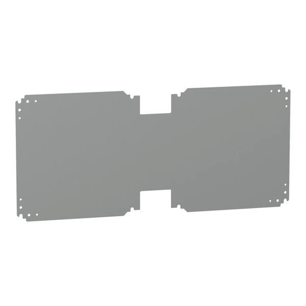 PanelSeT PLA Metall-Montageplatte. Für Gehäuse H500 x B1000 mm. Die Montageposition der Stufenschlitten oder die Position der hinteren Einsätze (Befestigung mit Schrauben Typ M8). Glatte Montageplatte. 150 Kg permanente zulässige Last. Verzinkter Stahl. Grau RAL 7035.