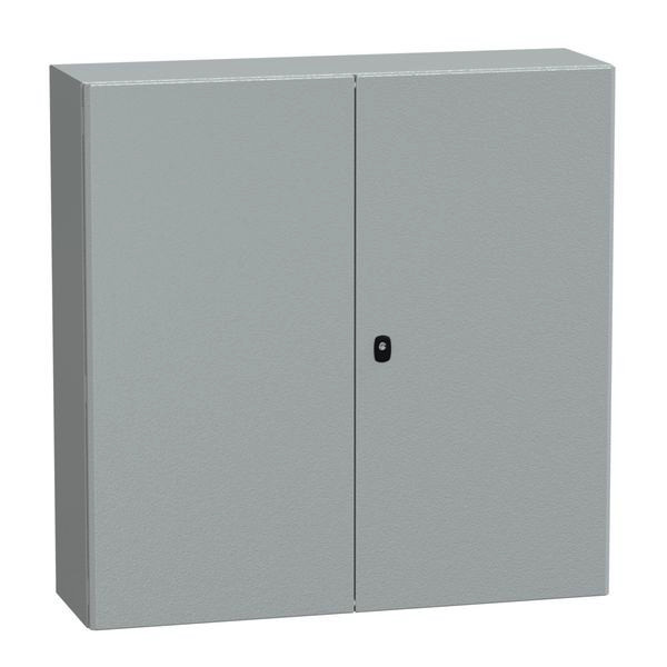 PanelSeT S3D Wandgehäuse aus Stahl mit 2 Volltüren. 1000 x 1000 x 1000 x 300 mm. Einteiliger Körper, ohne Montageplatte. 3-Punkt-Verschlusssystem mit Griff und 3 mm Doppelbartschliessung. Aus Stahl, Epoxid-Polyester-Pulverbeschichtung. Schutzart IP 55, IK10, Farbe RAL 7035. 2 Kabelverschraubungsplatten im Lieferumfang enthalten, Standard.