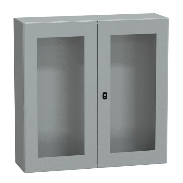 PanelSeT S3D wandmontiertes Stahlgehäuse mit 2 Glastüren. Einteiliges Gehäuse, ohne Montageplatte. Robuste Konstruktion auf Basis eines neuen Designs. 3-Punkt-Verschlusssystem mit Handgriff und 3-mm-Doppelstabschlosseinsatz. Aus Stahl, Epoxid-Polyester-Pulverlackierung. Rinnenförmige Frontschiene, doppelte Blechstärke. Schutzart IP 55, IK08, Grau RAL 7035. 2 Kabeldurchführungsplatten enthalten, Standard. Umfangreiches Angebot an Zubehör. Die Verpackung ist nach der Montage wiederverwendbar.