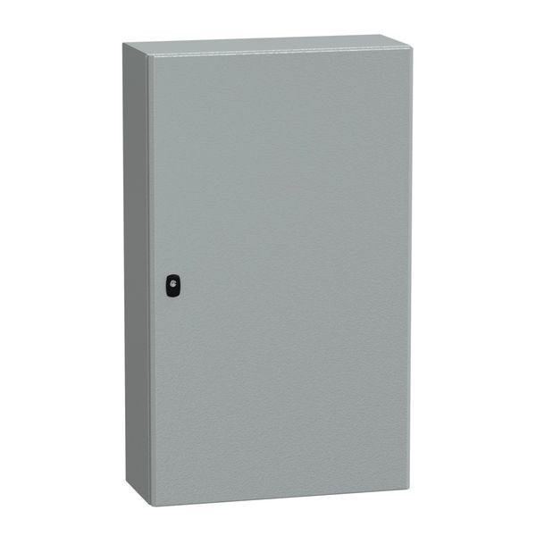 PanelSeT S3D Wandgehäuse aus Stahl mit Volltür. Einteiliges Gehäuse, inklusive Montageplatte. 3-Punkt-Verschlusssystem mit Griff und 3 mm Doppelbartschliessung. Aus Stahl, Epoxid-Polyester-Pulverbeschichtung. Schutzart IP 66, IK10, Farbe RAL 7035.