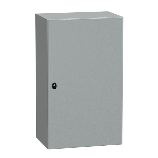 PanelSeT S3D Wandgehäuse aus Stahl mit glatter Tür. Einteiliges Gehäuse, Montageplatte und 1 Kabeldurchführungsplatte enthalten. 3-Punkt-Verschlusssystem mit Handgriff und 3-mm-Doppelstabschlosseinsatz. Aus Stahl, Epoxid-Polyester-Pulverlackierung. Schutzart IP 66, IK10, Grau RAL 7035.