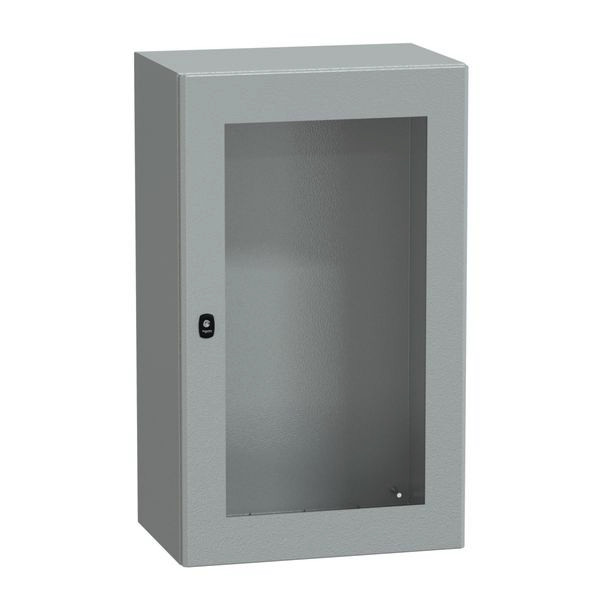 PanelSeT S3D Wandgehäuse aus Stahl mit Sichttür. Einteiliger Körper, ohne Montageplatte. 3-Punkt-Verschlusssystem mit Griff und 3 mm Doppelbartschliessung. Aus Stahl, Epoxid-Polyester-Pulverbeschichtung. Schutzart IP 66, IK08, Farbe RAL 7035. 1 Kabelverschraubungsplatte im Lieferumfang enthalten, Standard.