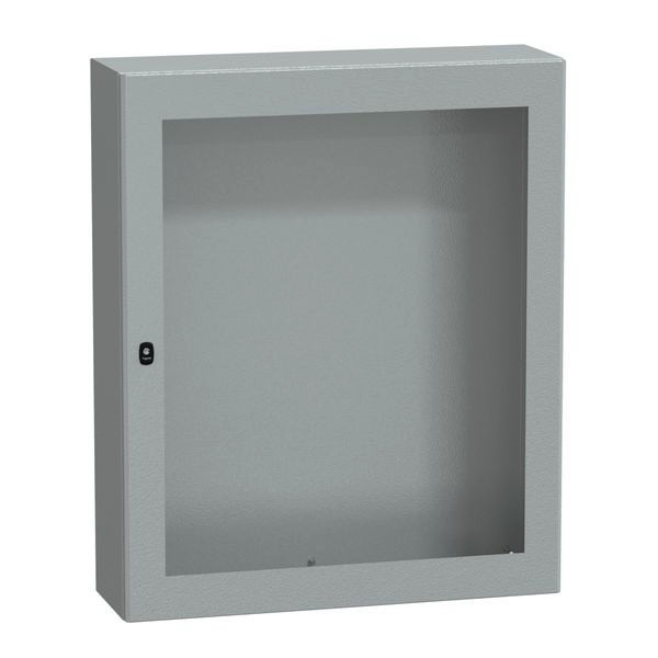 PanelSeT S3D Wandgehäuse aus Stahl mit Sichttür. Einteiliger Körper, ohne Montageplatte. 3-Punkt-Verschlusssystem mit Griff und 3 mm Doppelbartschliessung. Aus Stahl, Epoxid-Polyester-Pulverbeschichtung. Schutzart IP 66, IK08, Farbe RAL 7035. 2 Kabelverschraubungsplatten im Lieferumfang enthalten, Standard.