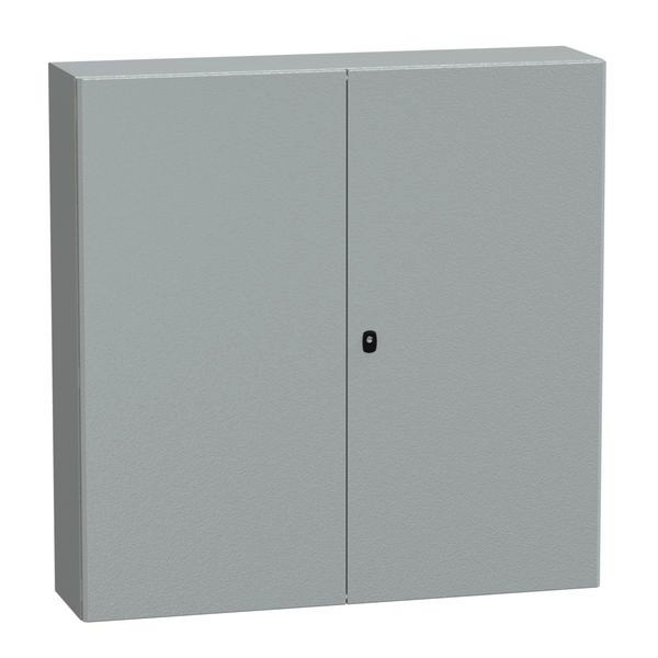 Wandschrank PanelSeT S3D aus Stahlblech mit Montageplatte. 1200 x 1200 x 300 mm. Korpus aus einem Stück gefalzt und verschweißt, verstärktes Vorderprofil in zweifacher Blechstärke als Regenrinnenprofil. Bündige Rückseite. IP66, IK10. Leicht aushängbare Tür, schneller Türanschlagwechsel, hervorragende Stabilität durch 20 mm starken Verstärkungsrahmen in doppelter Blechstärke, Türöffnung 120°, 2 oder 3 verdeckt liegende Scharniere. Dreipunktverschlusssystem mit nur einem Betätigungselement ab Bauhöhe 600 mm. Problemloser Gestängeumbau. Max. Belastbarkeit: 50 kg/m2. angefastes Türprofil, plasmaverschweißt, Beschichtung aus Epoxy-Polyester in RAL 7035.