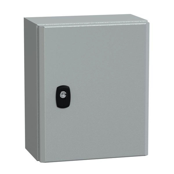 PanelSeT S3D Wandgehäuse aus Stahl mit Volltür. Einteiliger Körper, ohne Montageplatte. 3-Punkt-Verschlusssystem mit Griff und 3 mm Doppelbartschliessung. Aus Stahl, Epoxid-Polyester-Pulverbeschichtung. Schutzart IP 66, IK10, Farbe RAL 7035.