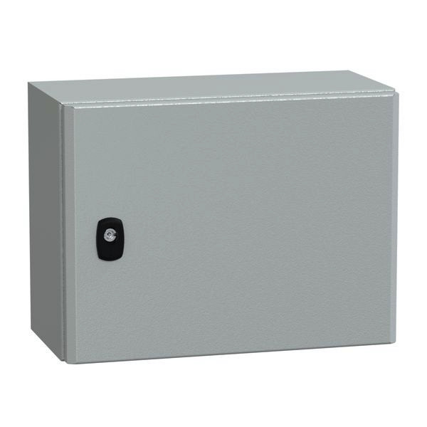 PanelSeT S3D Wandgehäuse aus Stahl mit glatter Tür. Einteiliges Gehäuse, ohne Montageplatte. Robuste Konstruktion auf Basis eines neuen Designs. 3-Punkt-Verschlusssystem mit Handgriff und 3-mm-Doppelstabschlosseinsatz. Aus Stahl, Epoxid-Polyester-Pulverlackierung. Rinnenförmige Frontschiene, doppelte Blechstärke. Schutzart IP 66, IK10, Grau RAL 7035. 1 Kabelverschraubungsplatte enthalten, Standard. Umfangreiches Angebot an Zubehör. Die Verpackung ist nach der Montage wiederverwendbar.