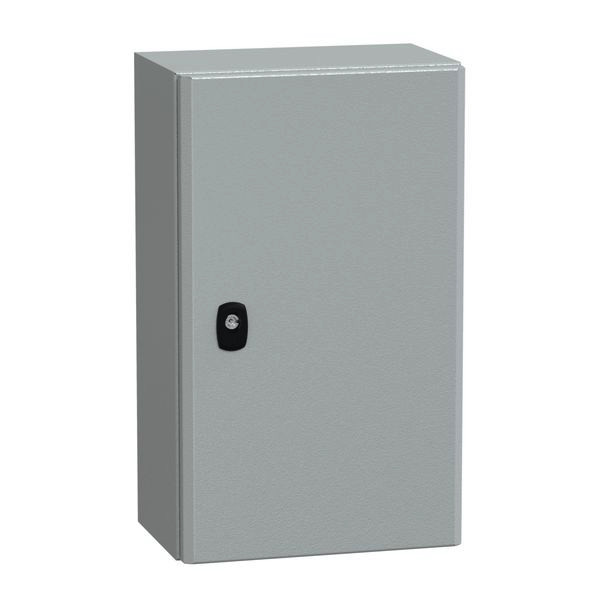PanelSeT S3D Wandgehäuse aus Stahl mit glatter Tür. Einteiliges Gehäuse, inkl. Montageplatte. 3 mm Doppelstabschloss-Einsatz. Aus Stahl, Epoxid-Polyester-Pulverlackierung. Schutzart IP 66, IK10, Grau RAL 7035.