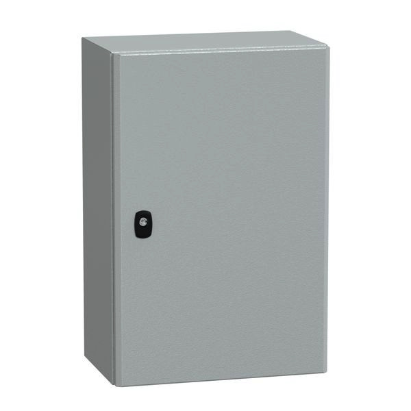 PanelSeT S3D Wandgehäuse aus Stahl mit glatter Tür. Einteiliges Gehäuse, inkl. Montageplatte. 3-Punkt-Verschlusssystem mit Handgriff und 3-mm-Doppelstabschlosseinsatz. Aus Stahl, Epoxid-Polyester-Pulverlackierung. Schutzart IP 66, IK10, Grau RAL 7035.