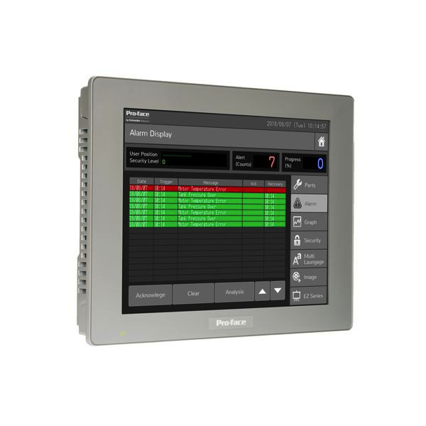 Das Pro-face SP5000 Advanced-Display ist in Kombination mit den unterschiedlichen SP5000 Box-Modulen einzusetzen. Diese Produktreihe wurden mit ihrer Performance und den flexiblen Auswahlmöglichkeiten passend für komplexe Maschinen und kleine Linien entwickelt. Hierbei stehen Konnektivität, Cybersicherheit für den Fernzugriff mit Pro-face Connect und flexible Kombinationsmöglichkeiten im Mittelpunkt. Das resistive Single-Touch Display in 12 Zoll wide screen mit einer Auflösung von 1280x800 Pixel dient der Visualisierung, Bedienung und Statusanzeige ihrer Anwendungen. Die Bedienoberfläche auf dem HMI wird mit der Software GP-Pro EX konfiguriert. Die äußeren Abmessungen des Displays betragen 308,5 mm (Breite) x 230,5 mm (Höhe) x 67 mm (Tiefe) bei einem Panel Cut-out von 295 mm x 217 mm. Das Produkt entspricht der Schutzklasse IP66F, IP67F, Typ 4X (Innenbereiche), Typ 13 (wenn ordnungsgemäß in einem Gehäuse installiert).