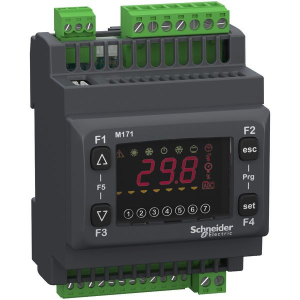 Die SPS-Steuerung Modicon M171 in Optimized Ausführung ist für einfache und kompakte Applikationen aus dem Bereich HLK-Maschinen und Pumpenautomatisierung ausgelegt. Dank ihrer kleinen Bauform ist sie platzsparend einsetzbar. Mit dem integriertem Display und Tasten lassen sich Steuerungsparametern direkt am Gerät einstellen. Die Steuerung verfügt über insgesamt 14 integrierte E/A, davon 5 konfigurierbare (U/I/T) analoge Eingänge, 4 digitale und 5 konfigurierbare (U/I/PWM/PPM) analoge Ausgänge. Die Spannungsversorgung erfolgt über 100 VAC bis 240 VAC. Die digitalen Ausgänge sind als Relais (2A / 230VAC) ausgeführt. Die Anschlüsse erfolgen mittels abnehmbaren Schraubklemmleisten (nicht im Lieferumfang enthalten). Montage auf 35mm Hutschiene. Wird mit kostenfreier Software EcoStruxure Machine Expert - HVAC programmiert. Zertifiziert nach CE, cURus (UL recognized), CSA, EAC, RCM, RoHS China.