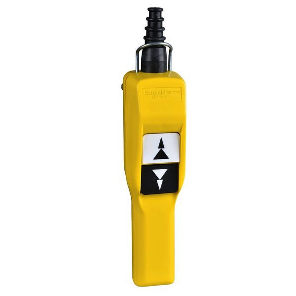 Pfeil: oben/unten Hängetaster mit 2 Drucktastern für Steuerkreise. Diese Gelbe Kontrollstation ist doppelt isoliert und das Gehäusematerial aus Polypropylen. Es gehört zur Baureihe der Hängetaster Harmony XAC für 22-mm-Kunststoff-Signaleinheiten mit Durchmesser.